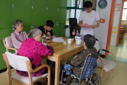由医学社招募的15名志愿者集合到达了普亲先锋社区老年养护中心,护工人员将15名志愿者分为了两队,一队在四楼负责与老人们一起体会剪纸的乐趣,另一队只留三人分配到较为轻松的五楼与老人们一同玩耍。在折纸过程中,很多志愿者不约而同地选择了折纸船,用不同颜色的纸折出来的纸船也勾起了老人们对童年的记忆,老人们说:“这个我小时候折过,现在不记得了。”而在五楼,有身体仍然健朗的老人则拉起一位志愿者跳起了舞。一些志愿者为了逗坐在椅子上的老人们,她们拿起手机和老人玩起了有特效的自拍。