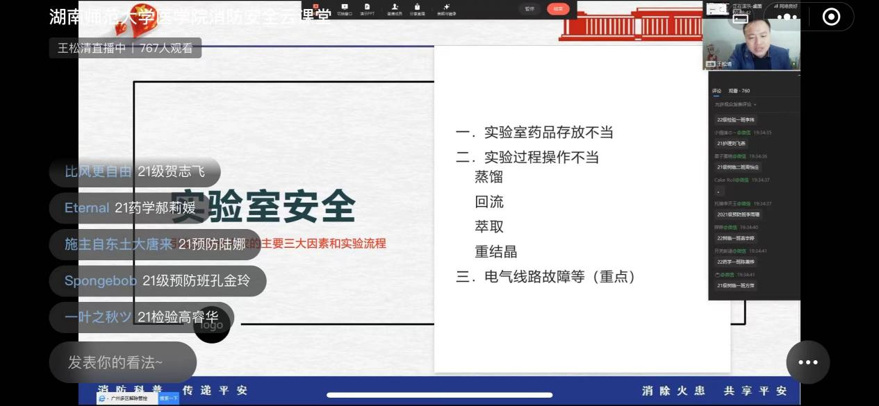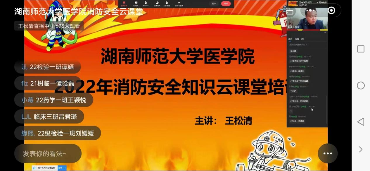 11月30日晚上,金沙官网组织全体教职工与学生通过“云课堂”开展线上安全教育学习。此次培训,由湘安消防培训部主任王松清教官主讲。